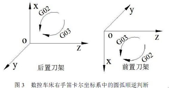 實踐證明,在實際生產過程中,可以不考慮右手笛卡爾坐標系,直接看零件圖就判斷出圓弧加工的左右補償,即在圓弧編程時,始終只分析零件圖軸線上半部分圓弧形狀,當沿該段圓弧形狀從起點畫向終點為順時針方向時就用GO2 ,反之就用 GO3。原因很簡單,車床指向刀架的為X 軸的正方向,指向尾座為Z 的正方向,那么前后刀架的X 軸的方向是相反的,就導致參與判斷的第三軸 Y 軸的正方向是相反的,一個指向紙外,一個指向紙內,如圖3 所示。在后置刀架的數控車床加工中,由于 Y 軸指向紙外,在 XOZ 坐標系中我們直接選擇工件的零件圖軸線上半部分圓弧形狀判斷圓弧順逆,而前置刀架的數控車床Y 軸指向紙內,我們選擇工件的零件圖軸線下半部分圓弧形狀判斷圓弧順逆時應該從紙內向紙外觀察,其結果正好與