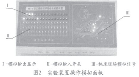 綜合實驗裝置電氣控制系統由兩部分組成:一部分是數控系統控制部分;另一部分是伺服放大器和電動機等強電執行部分。在控制部分,主要安裝有三菱數控系統顯示一體化控制器、基本I/O單元、機床操作面板、模擬操作和顯示平臺等。設計的機床實驗模擬面板如圖2所示,其中I區為模擬輸出狀態顯示,Ⅱ區為模擬輸入開關量,Ⅲ區為機床現場模擬信號。在執行部分,主要安裝了兩軸伺服一體化放大器、主軸變頻器、主軸位置編碼器、伺服電動機和主軸電動機、刀架電動機以及機床電器元件等,除機床的機械部分以外,數控機床電氣元件都清楚地安裝在實驗臺上,通過透明的有機玻璃可以很容易地理解數控機床電氣控制系統組成。