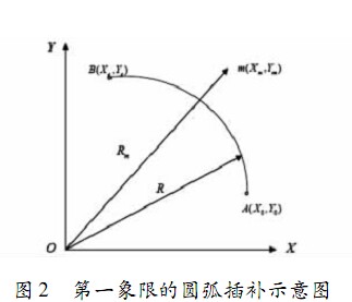 逐點(diǎn)比較法也能很方便地實(shí)現(xiàn)圓弧插補(bǔ)。與直線插補(bǔ)類似, 圓弧插補(bǔ)是將加工點(diǎn)到圓心的距離與被加工圓弧的名義半徑進(jìn)行比較, 并根據(jù)偏差大小確定進(jìn)給方向[2]。其在四個(gè)象限內(nèi)分為順圓弧和逆圓弧插補(bǔ)八種類型。典型的圓弧插補(bǔ)分為偏差判別、 坐標(biāo)進(jìn)給、 偏差計(jì)算、 終點(diǎn)判別四個(gè)步驟。第一象限內(nèi)逆圓弧插補(bǔ)如圖2 所示。