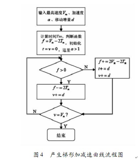 以加速階段分析: 其關(guān)系式可表示為 V = a* t。在給定最高速度 Vm 的情況下, 到達(dá)時(shí)間 Tm = Vm/a, 一般的實(shí)現(xiàn)方法是時(shí)間t 從0 開(kāi)始遞增, 對(duì)應(yīng)每個(gè)t 代入式v = a* t 中計(jì)算出v, 這個(gè)方法可行但是計(jì)算量太多, 涉及到浮點(diǎn)運(yùn)算。不利于在嵌入式系統(tǒng)中運(yùn)用。為了提高運(yùn)算的效率, 減小浮點(diǎn)運(yùn)算量, 利用插補(bǔ)算法, 以數(shù)字方式實(shí)現(xiàn)運(yùn)動(dòng)過(guò)程。采用最小偏差法, 來(lái)實(shí)現(xiàn)直線運(yùn)動(dòng), 軟件實(shí)現(xiàn)其過(guò)程的流程圖如圖4 所示。
