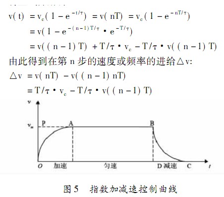 指數(shù)加減速曲線如圖 5 所示。它的加速和減速曲線是對(duì)稱的。下面以加速階段研究指數(shù)運(yùn)行曲線。其運(yùn)行速度公式為 v( t) = vc ( 1 - e- t /) , 其中 Vc 代表終點(diǎn)速度或是頻率, t 代表時(shí)間,代表調(diào)節(jié)系統(tǒng)時(shí)間常數(shù)。時(shí)間常數(shù) 反映了系統(tǒng)從速度0 變化到給定的最高速度的變化效率, 加速過(guò)程的時(shí)間受該常數(shù)的約束, 所以采用指數(shù)曲線進(jìn)行加減速要根據(jù)系統(tǒng)選好時(shí)間常數(shù) [3]。