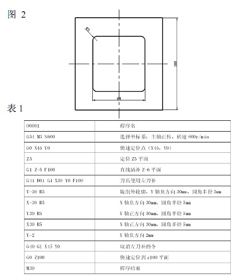 刀具半徑抵償功用還有一個重要的用處。假如刀具中心與工件概括偏差值不是一個刀具半徑, 而是給定值, 則可以用來處理粗加工中剩下廢料的疑問。在粗加工時,刀具半徑抵償值可認為刀具半徑加上精加工余量, 而在精加工時只輸入刀具實踐半徑值, 這樣可使粗加工和精加工選用同一個程序、 同一把刀具, 其抵償辦法為: 刀具偏置值=刀具半徑+精加工余量, 在粗加工時刀具半徑抵償值的巨細是可變的, 直到粗加工完結(jié), 最終留出精加工時的批改量;如下圖 2 所示, 毛坯標準為 100mm×100mm, 加工 60mm×60mm的外概括, 進行粗加工, 其編程如下表 1: