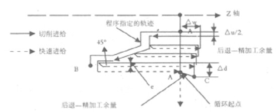 2)FANUC 系統 G7l 指令中各軸方向精車余量采用U 和 W 參數來表示 華中系統中 無凹槽加工時 各軸方向精車余量采用 X 和 Z 參數表示 有凹槽加工時 只需定義 X 方向的等高距離(精加工余量)