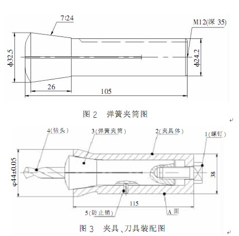 刀具 鉆頭 的夾緊方案 夾緊方法和夾緊裝置 根據(jù)鉆頭在加工中的使用特點 鉆頭的軸線必須與被加工孔的旋轉軸線重合 根據(jù)數(shù)控機床對夾具要求 即應具有可靠的夾緊力 具有較高的定位精度 具有較強的剛性 結構盡量簡單 以便于裝卸 鉆頭 和夾具在機床上的安裝 可采用已標準化的彈簧夾筒 即采用普通銑床上的銑刀彈簧夾筒 這樣可以滿足設計夾具 刀夾 要求 適應不同尺寸規(guī)格的直柄鉆頭 該裝置是利用彈簧夾筒的彈性變形將鉆頭定心并夾緊的 這只是作為過渡裝置用 彈簧夾筒如圖 2 所示