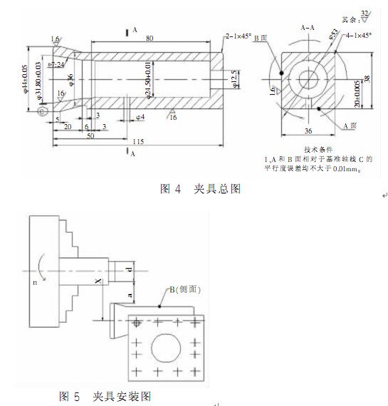 軸線的平行度誤差等 會引起被加工孔的軸線同軸度超差 即 A=0.02mm 3 加工方法有關的誤差 對刀調整誤差 鉆頭的跳動 滑板的間隙等因素所引起的加工誤差 約為 0.02mm 以上三項可 能 造 成 的 最 大 誤 差 為0.04mm夾具的使用說明本夾具適用于無尾座運動控制功能的經濟型數(shù)控車床 如 CJK6132A 型 適用于孔徑小于 16mm 的鉆孔 擴孔和鉸孔等場合 并且對孔的同軸度精度要求大于等于 0.04mm 采用不同直徑的鉆頭鉆孔 擴孔等操作 要相應地選擇不同規(guī)格的彈簧夾筒 本夾具類似普通車刀一樣安裝在車床刀架上 安裝要時保證中心高 注意擦凈各定位面 以及用百分表校正鉆頭軸線與車床主軸軸線的平行度通過檢驗 B 面的平行度來控制 對刀時 可暫時不裝夾鉆具首先用外圓車刀車一刀工件外圓 通過測量出夾具體 440.005mm 外圓至工件外圓的距離 a 值 求得 X=d+2 22+a 各參數(shù)如圖 5 所示 再將 X 值輸入到相應的刀偏號中 再裝上鉆具注意擦凈內圓錐孔表面 移動刀架使鉆頭至工件端面中心處輕碰工件端面 在相應的刀偏號中輸入 Z=0 夾具安裝時 各螺釘壓緊要適中 既要避免夾具變形 又要保證加工過程不能有松動現(xiàn)象 夾具的安裝如圖 所示