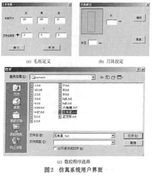 本仿真系統(tǒng)可通過兩個(gè)對(duì)話框定義毛坯的長L、 寬W、 高H、 工作坐標(biāo)系X、 Y、 Z以及刀具的規(guī)格直徑Ф、 對(duì)刀長度L用戶可通過一個(gè)文件對(duì)話窗體選擇數(shù)控程序PRO。具體的窗體界面如圖2所示。