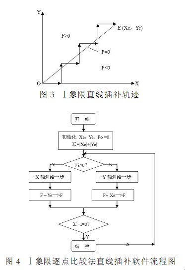 在圖 3 中 OE 為要加工的直線輪廓 而動(dòng)點(diǎn) N(Xi,Yi)對(duì)應(yīng)切削刀具的位置當(dāng)?shù)毒咛幱谥本€下方區(qū)域時(shí)(F<0) 當(dāng)?shù)毒咛幱谥本€上方區(qū)域時(shí)(F>0) 為了更靠攏直線輪廓 則要求刀具向(+X)方向進(jìn)給一步 當(dāng)?shù)毒哒锰幱谥本€上時(shí)(F=0)根據(jù)上述原則從 O(0 0)開(kāi)始 走一步 算一算 判別 F 符號(hào) 再趨向直線進(jìn)給 步步前進(jìn) 直至終點(diǎn) E 這樣 通過(guò)逐點(diǎn)比較的方法 控制刀具走出一條盡量接近零件輪廓直線的軌跡 如圖 3 中折線所示 當(dāng)每次進(jìn)給的臺(tái)階(即脈沖當(dāng)量)很小時(shí) 就可將這條折線近似當(dāng)作直線來(lái)看待 顯然 逼近程度的大小與脈沖當(dāng)量的大小直接相關(guān)為了簡(jiǎn)化運(yùn)算 通常采用遞推法 即每進(jìn)給一步后新加工點(diǎn)的加工偏差值通過(guò)前一點(diǎn)的偏差遞推算出