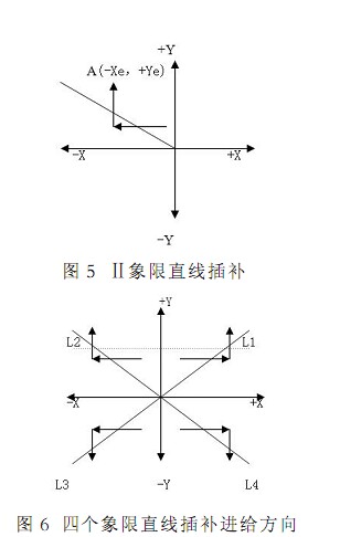 如果直接利用圖 7 來(lái)插補(bǔ)四個(gè)坐標(biāo)軸直線時(shí) 將會(huì)造成較大的插補(bǔ)誤差 顯然不太理想 為此 可對(duì)這四種特殊情況進(jìn)行專(zhuān)門(mén)處理 即當(dāng)判出是插補(bǔ)四個(gè)坐標(biāo)軸直線時(shí) 可將(+X)軸直線插補(bǔ)歸入(+△X)進(jìn)給方向類(lèi) 將(-X)軸直線插補(bǔ)歸入(-△X)進(jìn)給方向類(lèi) 將(+Y)軸直線插補(bǔ)歸入(+△ Y)進(jìn)給方向類(lèi) 將(-Y)軸直線插補(bǔ)歸入(-△Y)進(jìn)給方向類(lèi) 這樣可將其插補(bǔ)誤差減小到零