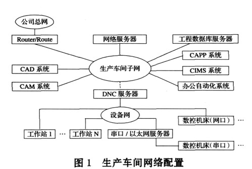 圖中 D N C 主機的主要任務是負責與數控機床的通訊控制, 通訊管理以及數控機床的狀態(tài)信息采集。產品設計、 工藝設計、 N C 程序生成、 生產調度和其他信息的管理則由 C I M S 計算機和車間服務器完成。從地域看這些工作集中在車間的技術辦公室進行。所有工作站和數據庫都掛在車間局域網上, 可方便地通過網絡交換各種制造信息。