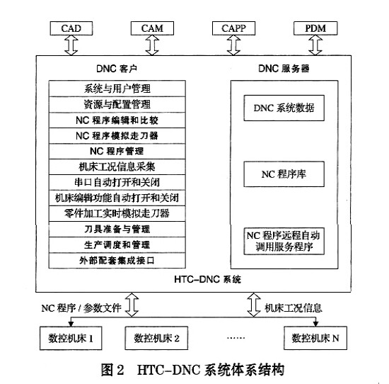 系統(tǒng)與用戶管理、 D N C 資源與配置管理、 N C 程序編輯和比較、 N C 程序管理、 N C 程序傳輸( N C 程序雙向交互式傳輸、N C 程序自動遠程調用) 、 機床工況信息采集、 外部系統(tǒng) ( 如: 生產調度和管理、 刀具準備與管理、 工具工裝集約管理、 零件毛坯管理等等) 關聯(lián)接口。