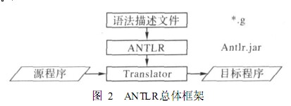 ANT LR總體框架如圖 2所示。在使用 Antlr時(shí) ,要先創(chuàng)建一個(gè)稱(chēng)為語(yǔ)法文件的文本文件 (. g文件 ) , 將自定義的詞法分析器和語(yǔ)法分析器的規(guī)則全部寫(xiě)在里面。Antlr就是通過(guò)讀取分析語(yǔ)法文件中的規(guī)則來(lái)生成詞法分析器與語(yǔ)法分析器的。Antlr語(yǔ)法文件的工作過(guò)程如下:首先 ,定義詞法分析器 Lexer類(lèi) ,在類(lèi)中定義各種 Token;然后 ,定義語(yǔ)法分析器Parser類(lèi) ,在類(lèi)中使用 EBNF語(yǔ)法 ,遞歸定義各種句子 , Parser類(lèi)負(fù)責(zé)把讀入的 Token串匹配成句子 ,翻譯出 AST(抽象語(yǔ)法樹(shù) ) ;最后 ,定義用于處理 AST的 TreeParser類(lèi) ,根據(jù) Parser類(lèi)分析出來(lái)的 AST(抽象語(yǔ)法樹(shù) )進(jìn)行動(dòng)作。Antlr語(yǔ)法文件具體組成部分及規(guī)則解析參見(jiàn)文獻(xiàn) [ 6 ]。