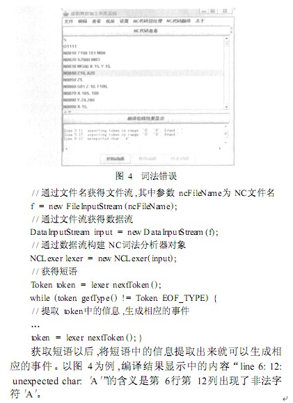數(shù)控程序中出現(xiàn)非法字符主要指以下兩種情況:第一種情況為含有系統(tǒng)無(wú)法識(shí)別的字符。在本編譯系統(tǒng)中 ,系統(tǒng)可識(shí)別的字符集為 { G, X, Y, Z, H, D, F, O, N, I , J, K,M, S, T,R. , ; , % } ,阿拉伯?dāng)?shù)字 0~99,若數(shù)控程序內(nèi)出現(xiàn)“A” 等字符集所不包含的字符時(shí) ,則認(rèn)為數(shù)控程序含有非法字符。第二種情況是由系統(tǒng)可識(shí)別字符集組成的系統(tǒng)無(wú)法識(shí)別的字符串。這種錯(cuò)誤一般是由于用戶(hù)的誤操作造成的 ,包括以下兩種: 1)沒(méi)有相應(yīng)的數(shù)控功能與字符串相匹配 ,如“7100” ,“M890” ,“MFO 1” 等均屬于這種情況; 2)數(shù)值格式輸入有誤 ,如 150正確的表達(dá)應(yīng)為“150 . ” ,但若用戶(hù)在中間輸入空格則變成“1 5 0 . ” ,這種情況在本編譯系統(tǒng)中也被視為是數(shù)值格式輸入錯(cuò)誤的一種。