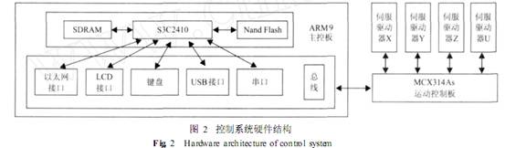 在 ARM9主控板上設(shè)計(jì)有一個(gè)總線接口電路 ,這個(gè)電路已經(jīng)把 S3C2410芯片上的一些信號(hào)線包括 16位數(shù)據(jù)線、 12位地址線、 片選信號(hào)和一些讀寫(xiě)控制信號(hào)線引出來(lái) ,方便用戶(hù)擴(kuò)展應(yīng)用電路。運(yùn)動(dòng)控制芯片 MCX314As與 S3C2410處理器的連接就是通過(guò)這個(gè)標(biāo)準(zhǔn)的總線接口電路 ,把兩者的數(shù)據(jù)線、 地址線、 讀寫(xiě)控制線、 片選信號(hào)和中斷等信號(hào)連接起來(lái)。控制系統(tǒng)硬件結(jié)構(gòu) ,如圖 2所示。從圖中可以看出 ,除了數(shù)控裝置采用了上下位分機(jī)的設(shè)計(jì)方法 ,在 ARM9的主控板的設(shè)計(jì)上也采用了 ARM9核心板和 ARM9主控用戶(hù)板的這種分開(kāi)的模塊化結(jié)構(gòu)。核心板是 ARM9處理器的最小系統(tǒng) ,只包括簡(jiǎn)單的 S3C2410芯片、 RAM和 ROM存儲(chǔ)器;而用戶(hù)板可以靈活剪裁設(shè)計(jì) ,根據(jù)實(shí)際需要可以在板上設(shè)計(jì) LCD接口、 US B接口、 以太網(wǎng)接口、IIS接口、 UART接口、 ADC模數(shù)轉(zhuǎn)換接口以及 GPRS等外部硬件接口[ 3 ]。核心板與用戶(hù)板兩者以標(biāo)準(zhǔn)的接口連接 ,有利于用戶(hù)的升級(jí)或二次開(kāi)發(fā) ,用戶(hù)可以在不改變核心部分的情況下需只修改剪裁用戶(hù)板 ,或者在不改變用戶(hù)板的情況下更換核心板 ,就能夠開(kāi)發(fā)升級(jí)嵌入式數(shù)控系統(tǒng)數(shù)控裝置的硬件。