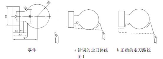 外圓刀經(jīng)常撞刀現(xiàn)象如圖1 這種情況,主要在退刀的過(guò)程中 G00 走刀路線是折線或者是直線而且進(jìn)給速度快并且不受操作者控制,本例中刀具加工到 40 這個(gè)外圓后進(jìn)行退刀,在其刀具退回目標(biāo)點(diǎn)時(shí)移動(dòng)路線中與 SR25 球發(fā)生干涉,與工件發(fā)生碰撞,造成撞刀 這個(gè)圖的編寫(xiě):