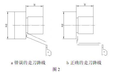 切槽刀常見(jiàn)撞刀現(xiàn)象如圖2 主要有兩種情況: 1 在是進(jìn)刀過(guò)程中刀具與工件 48 外圓發(fā)生干涉,導(dǎo)致零件報(bào)廢和刀具碎裂等 2 是退刀過(guò)程中刀具退刀路線與工件發(fā)生不應(yīng)有的撞擊 在編寫(xiě)程序時(shí)針對(duì)切槽刀應(yīng)注意以下三點(diǎn)就可避免切槽刀撞刀現(xiàn)象發(fā)生: