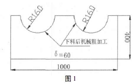 本部件兩半圓切割口下料后需要機械加工, 由此可見對切割面的表面粗糙度要求相對高一些, 而且板厚60 ㎜ 如用手工下料難以保證圓弧的平滑過渡和垂直度 又因為批量不是太大, 不適合使用仿形切割, 使用數控火焰就解決了以上困難點