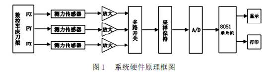 在數控車床的加工中,切削力的丈量甚為重要。經過對切削力的丈量能夠剖析與研討數控車床各零部件、組織或構造的受力狀況和作業狀況,驗證規劃和計算成果的正確性,確定整機作業過程中的負載譜和某些物理表象的機理。為了便于丈量和研討數控車床切削力起見,特別是為了習慣出產中規劃和運用數控機床、刀具和夾具的需求,通常都把總切削力F 分解成三個相互筆直方向的力,即Fz 、Fy 、Fx 來研討。體系硬件原理框圖如圖1 所示。體系以MCS8051 單片機為操控中心,外圍電路對于單片機的功能特色而規劃,充分利用了MCS8051 單片機片內資源豐富的特色,簡化了外圍電路,提高了可靠性。下面臨體系中首要功能模塊與硬件可靠性技能逐個剖析。