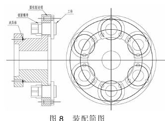 夾具由夾具體、定位裝置、夾緊裝置三部分組成。夾具體與機床主軸通過主軸定位錐面與主軸法蘭盤相連接(與自定心卡盤在車床主軸上的安裝連接原理相同), 同時具備對工件進行安裝定位和夾緊等裝置。 其結構簡單,但制造較為復雜。 其裝配圖如(圖 8)所示: