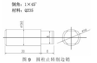(2)安裝止轉定位削邊銷(準11h6)的削邊方向應垂直于削邊銷中心與夾具體中心的連線,削邊銷軸線則垂直于夾具體的大端面。 止轉削邊銷如(圖 9)所示