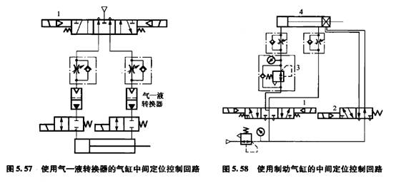 利用制動氣缸可以實(shí)現(xiàn)中間定位控制,其回路如圖5. 58所示。在該回路中,三位五通電磁換向閥1的中位機(jī)能應(yīng)為中位加壓型。電磁閥2用來控制制動活塞的動作,因?yàn)橹苿託飧?/span>4的制動活塞有雙作用型和單作用型兩種,所以,若制動活塞為雙作用型,電磁閥2應(yīng)采用二位五通閥;若制動活塞為單作用型,電磁閥2應(yīng)采用二位三通閥。利用帶單向閥的減壓閥3來進(jìn)行負(fù)載的壓力補(bǔ)償。當(dāng)電磁閥1, 2不通電時,氣缸在行程中間定位并制動;當(dāng)電磁閥2通電時,制動解除。