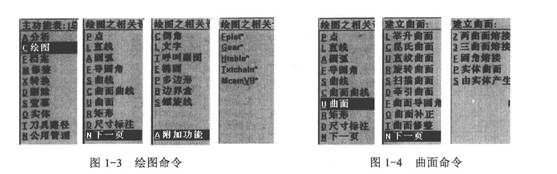 主菜單中的繪圖(Create)命令,包括了生成點(diǎn)、直線、圓弧、倒圓角·、曲線、曲面曲線、尺寸標(biāo)注、倒角、文字、呼叫副圖、橢圓、多邊形、邊界盒、螺旋線、齒輪、圓表和自定義函數(shù)表達(dá)式繪圖等線框造型命令,以及曲面造型命令,如圖1-3所示。