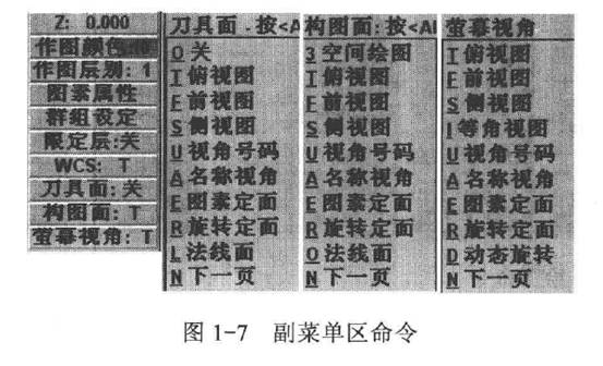 副菜單區(qū)包括Z: 0.000(工作深度設(shè)定Z: 0.000)、作圖顏色:10 (Color: 10)、作圖層別:1(Level: 1)、圖素屬性(Attributes )、群組設(shè)定(Groups)、限定層:關(guān)(Mask: OFF)、WCS:T、刀具面:關(guān)(Tplane: OFF )、構(gòu)圖面:T <Cplane: Top)和螢?zāi)灰暯?/span>:T ( Gview: Top)等命令,如圖1-7所示。