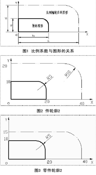 比例縮放功能的編程主要有兩個(gè)要素:縮放中心和各坐標(biāo)軸縮放比例如果在G51編程格式中省略了X, Y, Z,則刀具當(dāng)前所處位置為縮放中心。比例系數(shù)與圖形的關(guān)系見圖1,粗實(shí)線繪制的是原始零件輪廓,雙點(diǎn)畫線表不以。點(diǎn)為縮放中心,縮放后得到的零件輪廓,其中a/b表}X軸方向的比例系數(shù)、d/c表}Y軸方向的比例系數(shù)