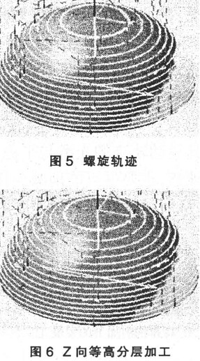( 6) Z向等高分層加工( 圖 6) 。生成 Z向等高分層軌跡的方法是用指定等距離的一組水平面對工件進行切片, 從而得到工件加工曲面的等高線, 以此作為刀具與加工曲面的接觸點, 補償后的得到刀具軌跡。對于該類加工策略, 由于刀具軌跡為 Z向定距下降, 容易存在對水平或接近水平的淺灘平面行距過大的問題。對于陡斜面, 刀具路徑可能過于密集, 而水平或淺灘平面將因行距過大而得到較大的殘留高度。